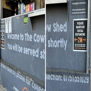 The Cow Shed offers gourmet flame-grilled burgers, flavoured chicken in brioche buns, wraps, salads, and butchers sausages. There are also breakfast options like bacon rolls and drinks including coffees and assorted beverages.